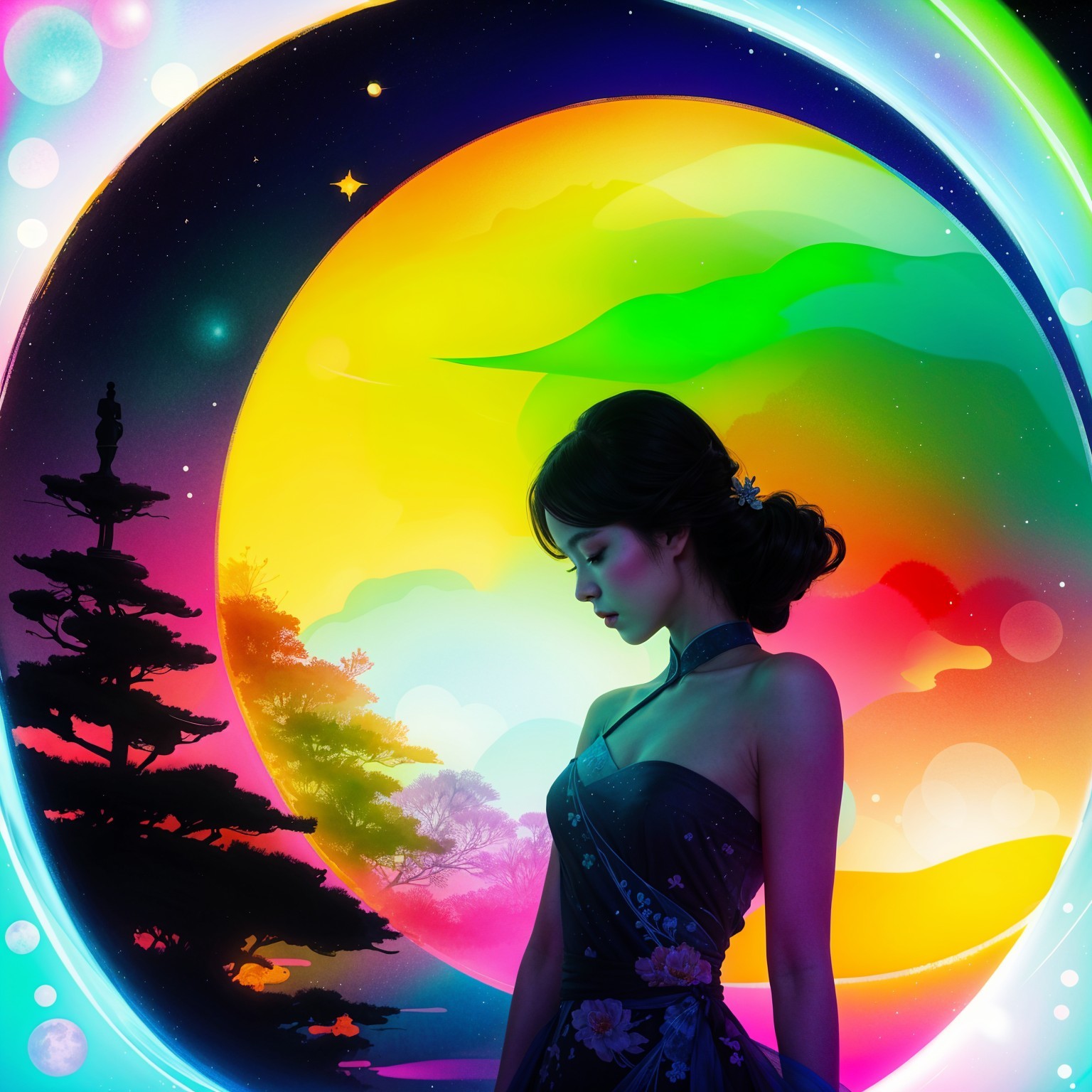 A serene woman in a dark blue dress stands against a vibrant circular background. Colorful butterflies swirl around her, enhancing the enchanting and dreamy atmosphere of the artwork.