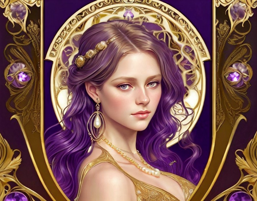 A woman with elegant, wavy purple hair and ornate jewelry gazes softly. Her delicate features are framed by a floral, golden design with hints of deep purple and shimmering jewels.
