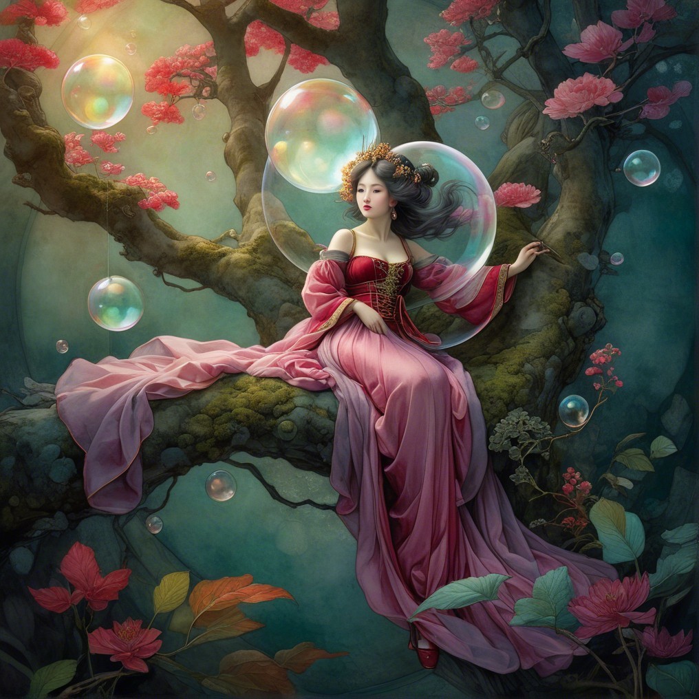Beauty girl in a bubble,, Medieval Japanese Artists Sumi-e Style, Teal, grey-green, Ruby red, Velvet Black, Shabby, Dull Gold, Amber Gray, Golden Ratio, Surreal Fantasy, Elegant, High Definition Ultra Fine 3D Line, Zenangle Style, Watercolor Patchwork , Arthur Rackham and Michael parkes Style, Paul Kidby, , Jacek yerka, Extremely Detailed, Intricate, Thoughtful, HDR, Fractal, Beautiful, Award Winning, Fantasy Look, Fantasy, Crisp Quality