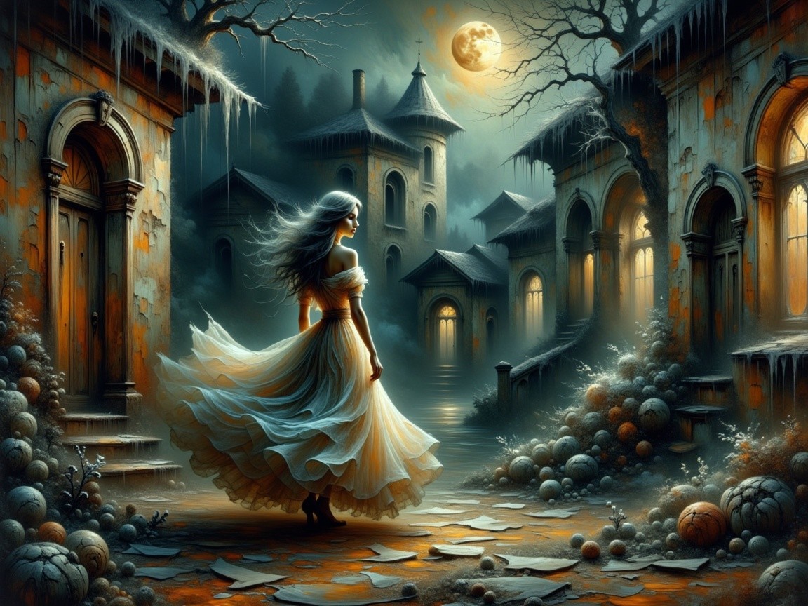 A woman in a flowing, elegant gown stands in a dimly lit, grand staircase of an ornate mansion. Ethereal drapes cascade around her as soft light filters through, creating a hauntingly beautiful atmosphere.