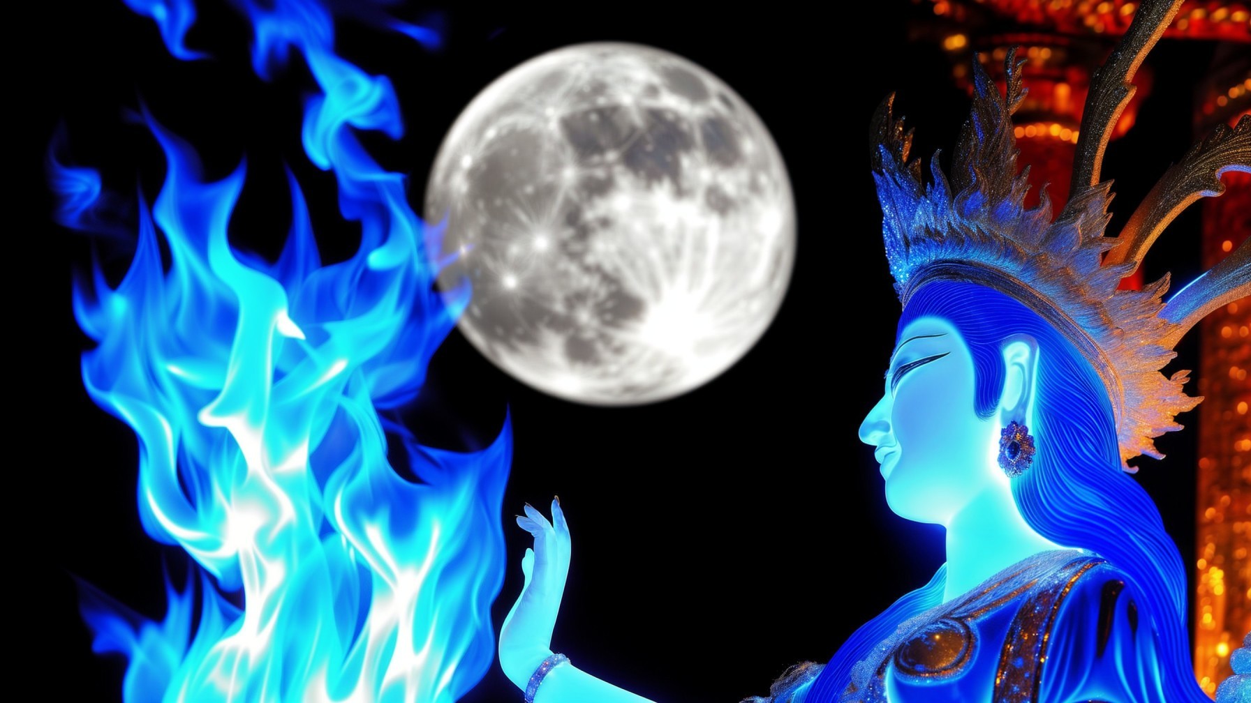 A luminous figure radiates serenity, surrounded by vibrant blue flames, with a large, glowing full moon in the background, creating a striking contrast of light and color.