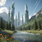 In a serene landscape, towering futuristic structures rise amidst lush greenery and a tranquil river, with majestic mountains in the background under a clear blue sky. Nature intertwines with architecture.