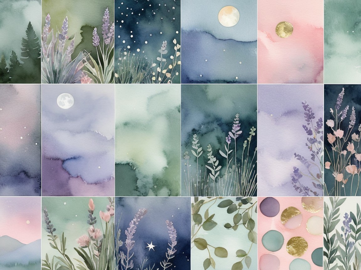 A collage of watercolor landscapes featuring dreamy night skies, soft pastel hues, and delicate flowers. Each panel showcases serene nature scenes with moons, stars, and lush vegetation.
