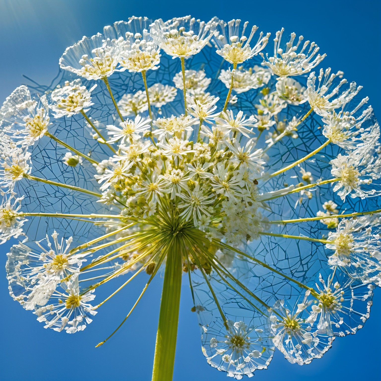 The image showcases a whimsical scene of ethereal, glowing flowers resembling dandelions, surrounded by a dreamy blue atmosphere, evoking a sense of enchantment and tranquility.