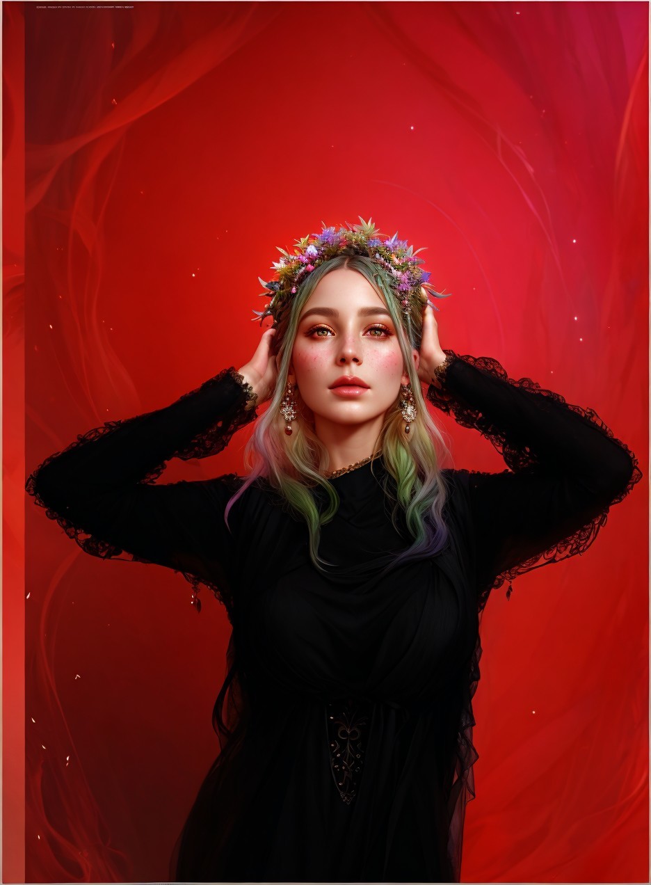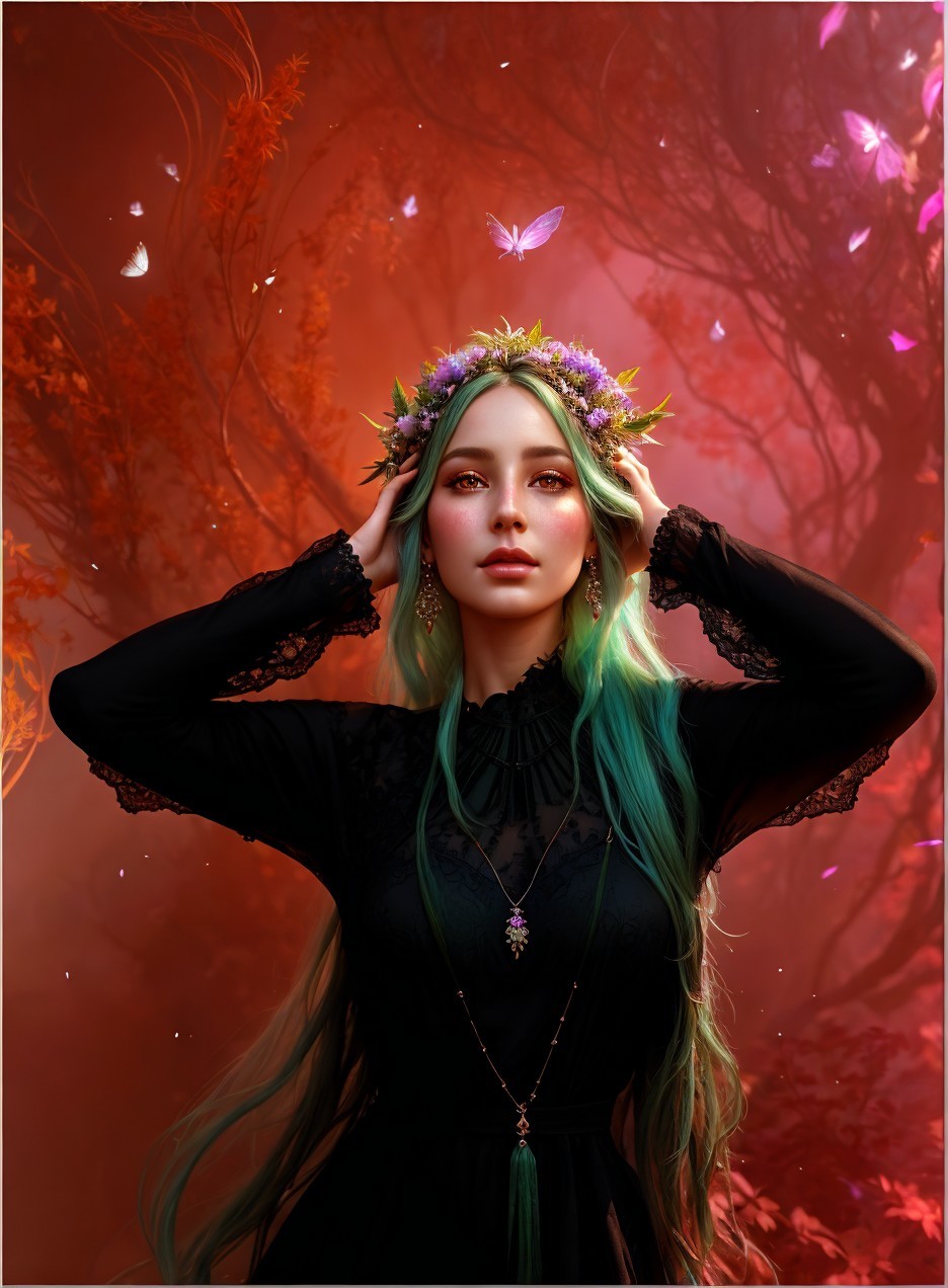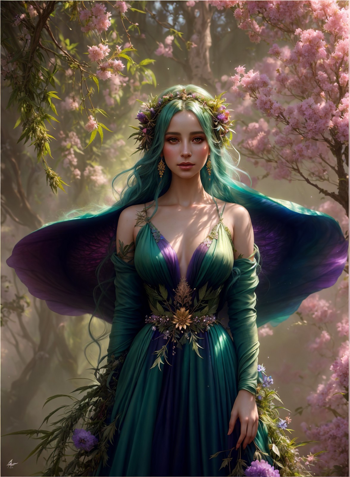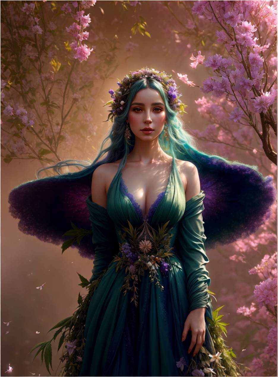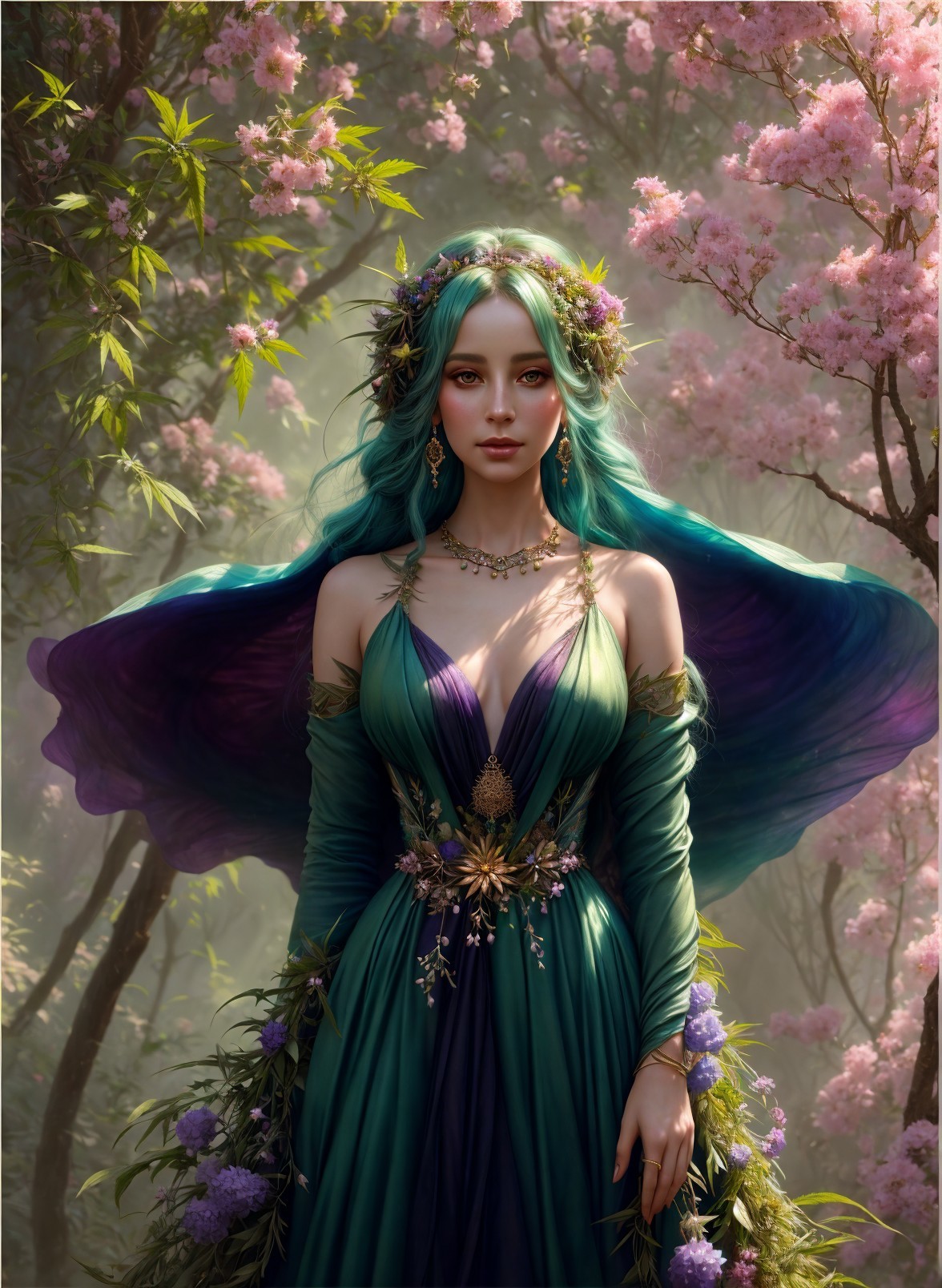 Full view portrait mystical ethereal herbs goddess wearing a beautiful dress, herbs dryad.