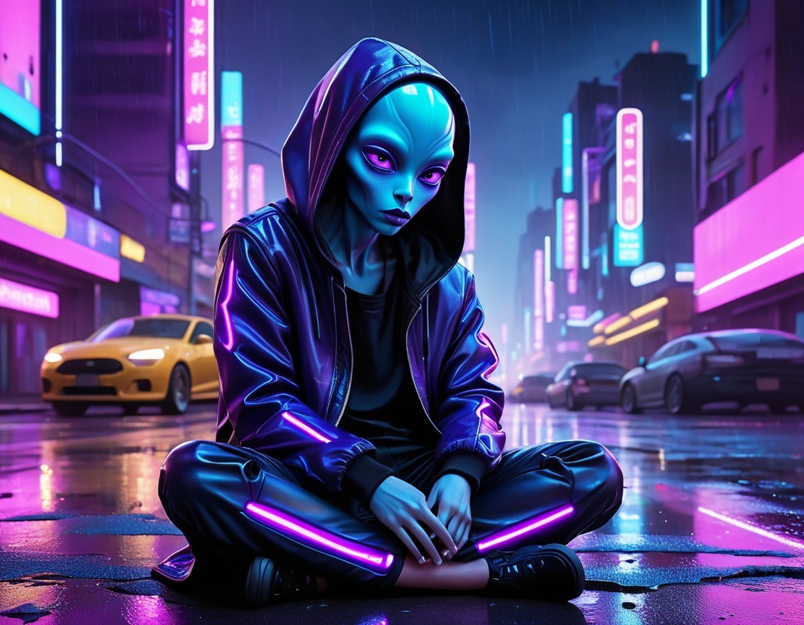 Prompt: "A digital artwork depicting a futuristic cityscape at night, illuminated by vibrant neon lights in shades of purple, blue, and pink. The foreground features an alien with a smooth, blue skin tone, large expressive eyes, and a distinctive elongated head, sitting cross-legged on a wet asphalt street with visible cracks and patches. The alien wears a loose-fitting dark hooded jacket or hoodie, its fingers extended towards a puddle reflecting the neon lights. The reflective surface below creates striking visual effects, mirroring the alien's form and the colorful cityscape around it. In the midground, several human figures dressed in dark coats can be seen walking along the street, appearing as silhouettes against the bright neon signs. Various vehicles are parked along the road, adding depth to the scene. The background showcases tall buildings with glowing windows, creating a dense urban skyline. Neon billboards with foreign text contribute to the bustling atmosphere, while power lines crisscross overhead. A prominent vertical sign reading 'TONY' in white letters within a pink outline stands out among other neon advertisements. The sky above is overcast and cloudy, enhancing the mysterious ambiance of this cyberpunk setting. The overall mood is contemplative and slightly melancholic, with high contrast between the brightly lit neon elements and the darker areas of the cityscape."