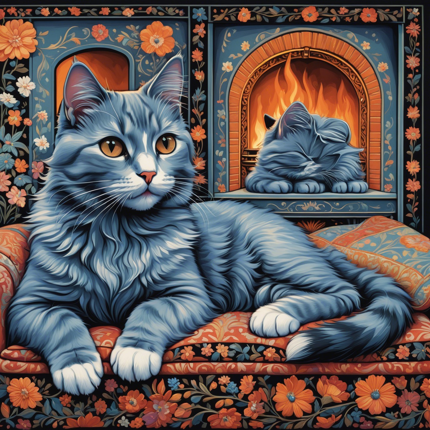 A fluffy gray cat lounges on a floral couch, while a smaller gray kitten peeks out from a cozy fireplace. The backdrop features ornate floral patterns and warm, glowing flames.
