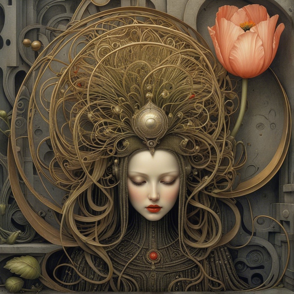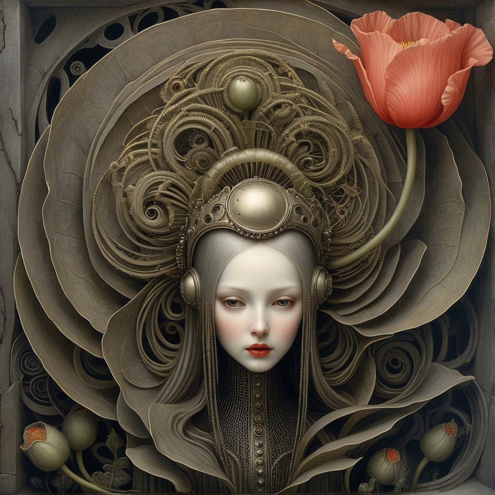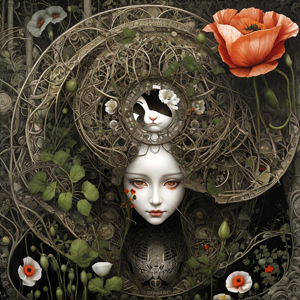 A surreal, intricate composition featuring a serene face surrounded by ornate, flowing patterns and vibrant poppy flowers, blending nature with art in a dreamlike manner.