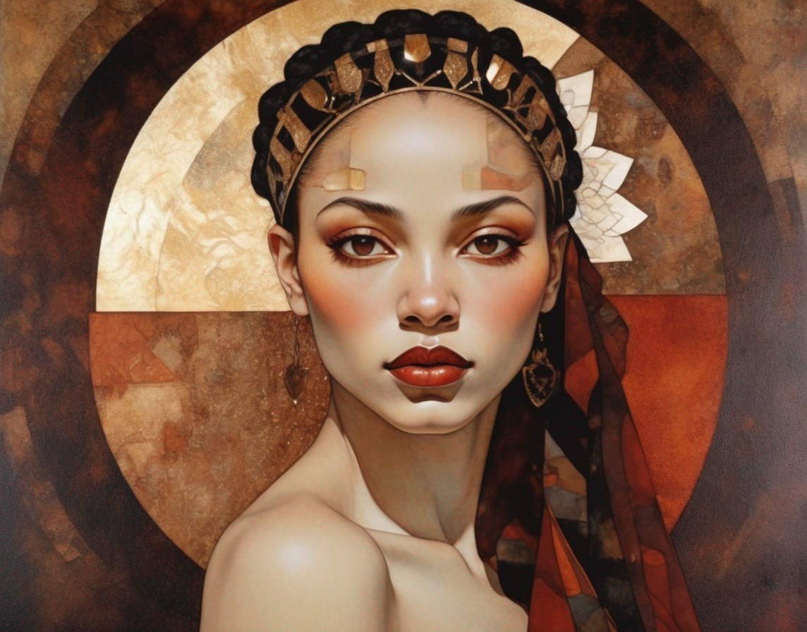 A stylized portrait of a woman with a decorative headdress, featuring warm tones, intricate patterns, and a prominent red rose.