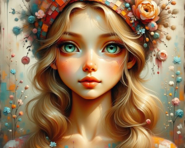 A serene landscape features a young woman with flowing red hair adorned with flowers, gazing over a tranquil lake at sunset. Vibrant colors and swirling patterns enhance the enchanting scene.