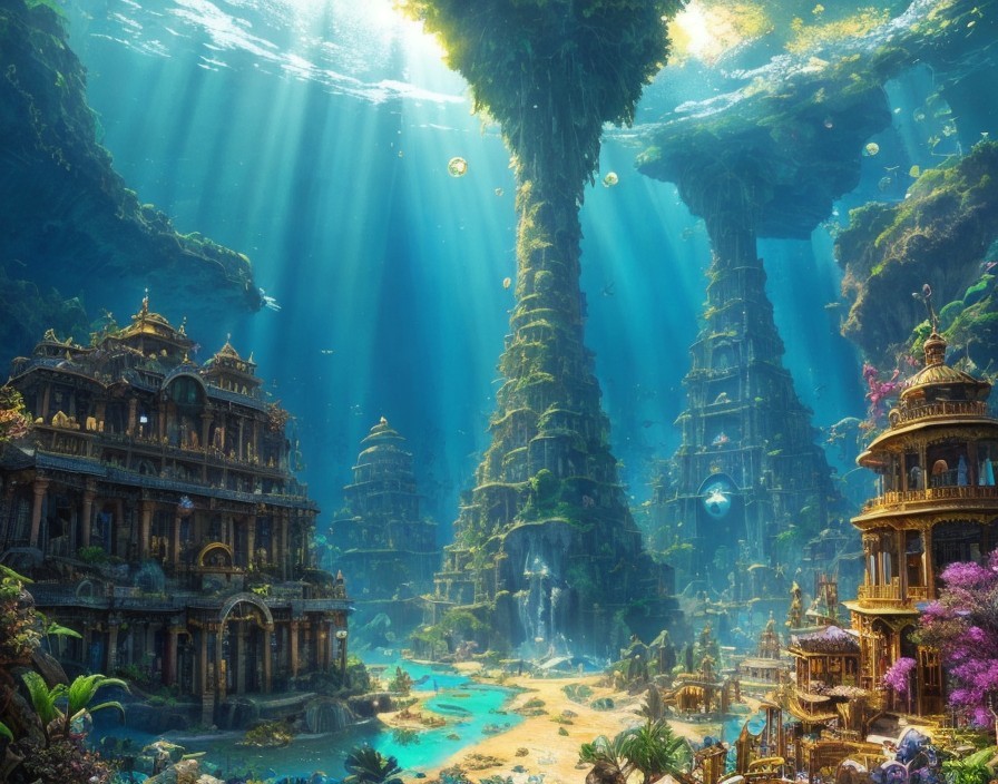Prompt: An underwater city with intricate architectural designs. Sun rays penetrate the water surface illuminating the buildings and surrounding flora. The buildings are adorned with golden and bronze hues and are surrounded by various aquatic plants. Fishes can be seen swimming amidst the structures, adding life to the scene. The overall atmosphere is mystical and enchanting due to the play of light and shadow.