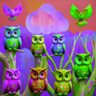 A vibrant, whimsical illustration of eight colorful owls perched on tree branches, set against a dreamy purple and pink sky with soft clouds and playful leaves.