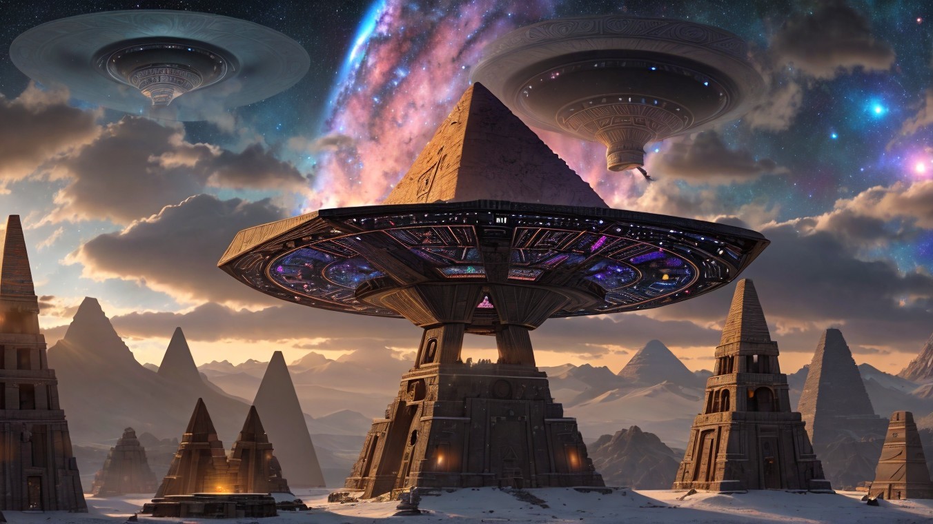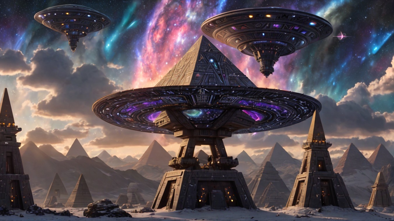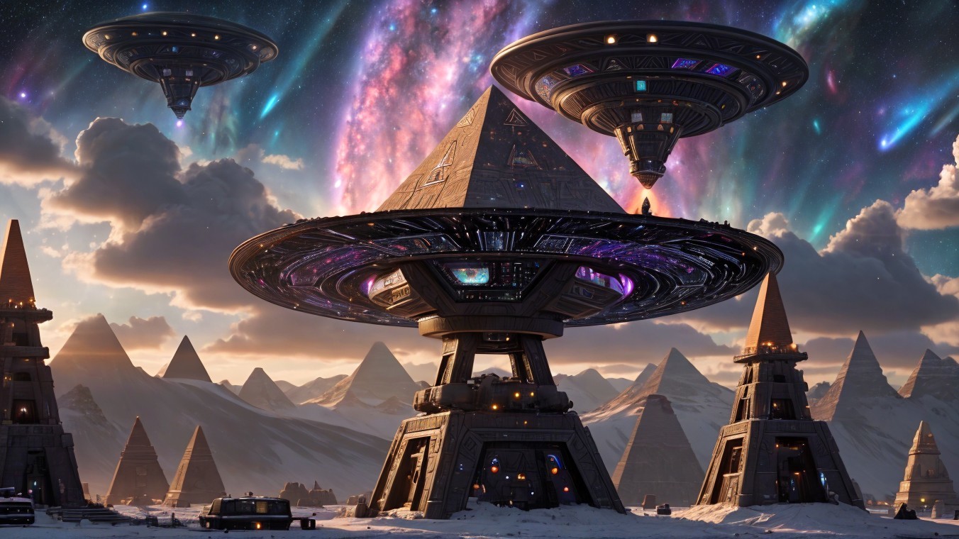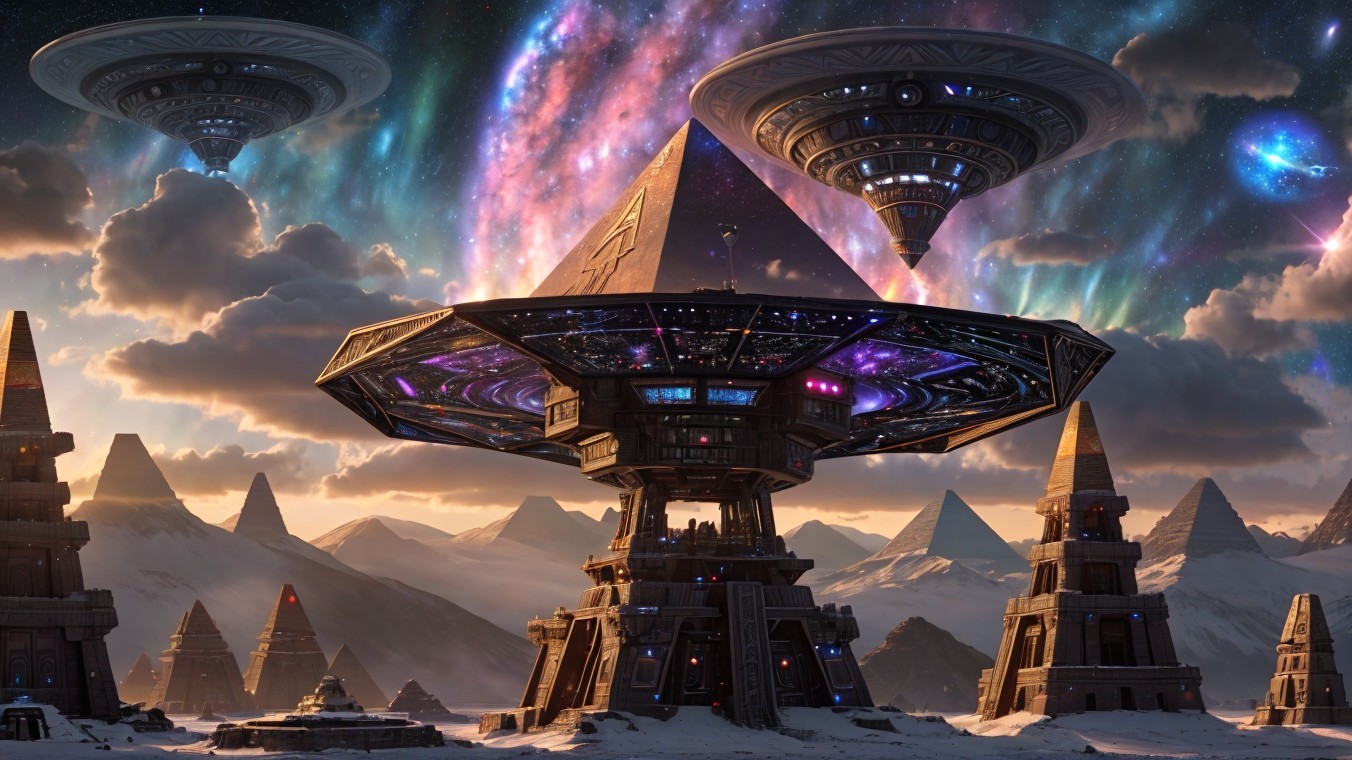 A sci-fi landscape with pyramids, futuristic towers, and colorful nebulae in the sky.