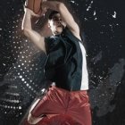 A dynamic basketball player in a black jersey jumps toward the hoop for a slam dunk. He showcases athleticism against a backdrop of abstract silver spheres and a dark setting.