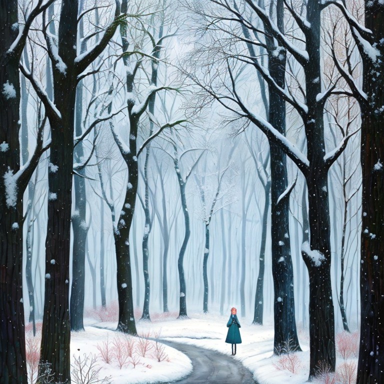 Snow-covered trees and falling snowflakes in a whimsical winter forest scene