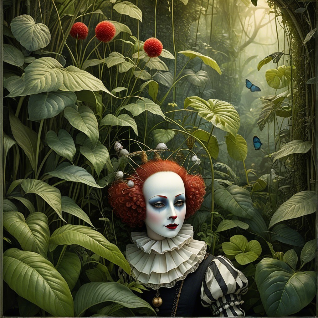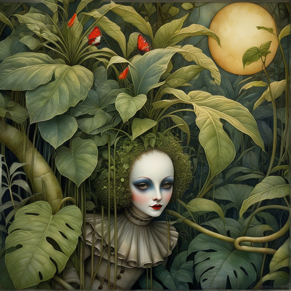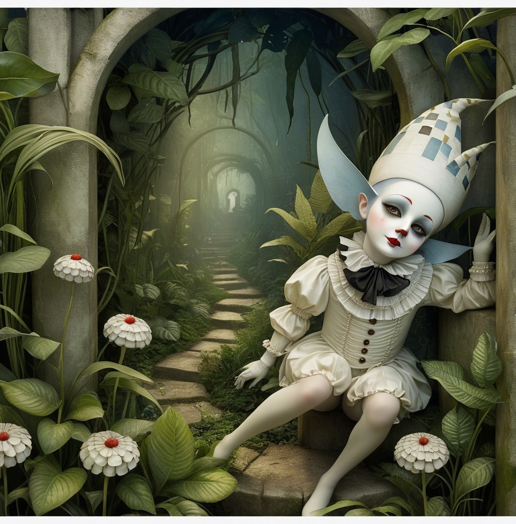 A whimsical scene features a doll in a pointed hat sitting amidst lush greenery and oversized flowers, with a mysterious stone pathway leading to a shadowy archway in the background.