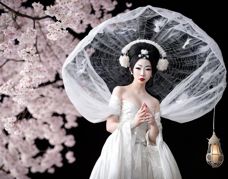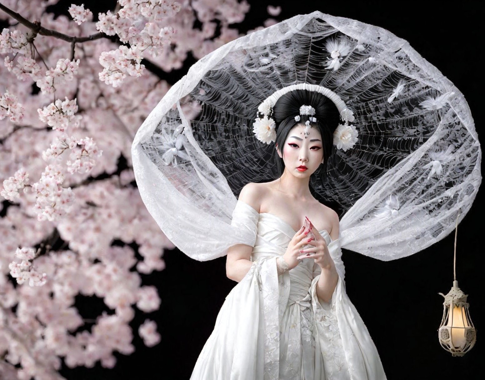 (Try it from Tho'Mood) - A woman in traditional Asian attire with a white, lacy parasol stands before cherry blossoms.