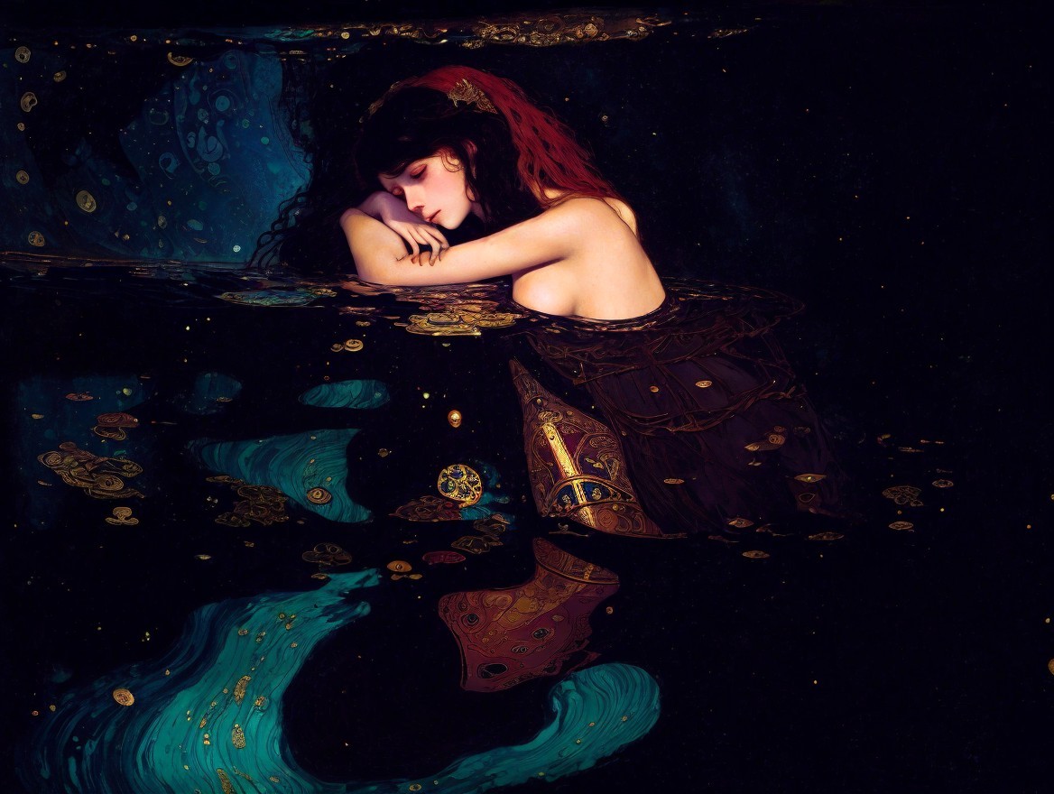A painting of a woman with dark hair adorned with red flowers, resting on her arms above a starry, cosmic water-like surface.