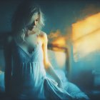 A woman in a delicate white dress sits on a bed, bathed in soft, warm light streaming through a nearby window. The serene atmosphere emphasizes her tranquility and elegance.