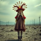 A young girl stands in a desolate landscape, wearing a large, ornate hat adorned with leaves. Her long hair flows down, and she appears solemn amidst barren trees and scattered debris.