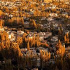 A quaint, autumnal village nestled among vibrant orange trees, featuring charming wooden homes with steep roofs, a cobblestone path, and a serene waterfront with a small boat.