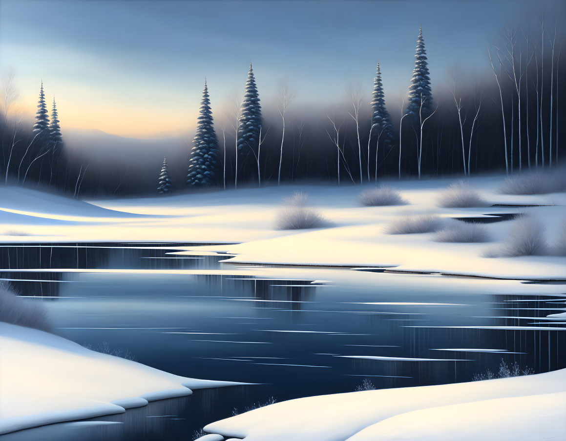 Prompt: Create a captivating painting titled that portrays a serene winter landscape. The color palette should be dominated by cool tones, featuring shades of icy blues, soft grays, and hints of crisp whites. The focal point of the painting is a snow-covered landscape, conveying a sense of stillness and tranquility. Use a combination of broad, sweeping brushstrokes and delicate, intricate details to depict the textures of snow-laden trees, frozen lakes, and distant mountains. The sky should have a soft, diffused light, suggesting a hazy winter ambiance. Include subtle touches of warm colors, like gentle pinks and soft oranges, to represent the soft glow of the winter sunrise or sunset. Infuse the painting with a sense of calmness and serenity, inviting the viewer to embrace the quiet beauty of winter. Aim to generate a painting that captures the essence of a winter's day, evoking a sense of awe and inviting viewers to find solace in the beauty of nature's winter cloak.