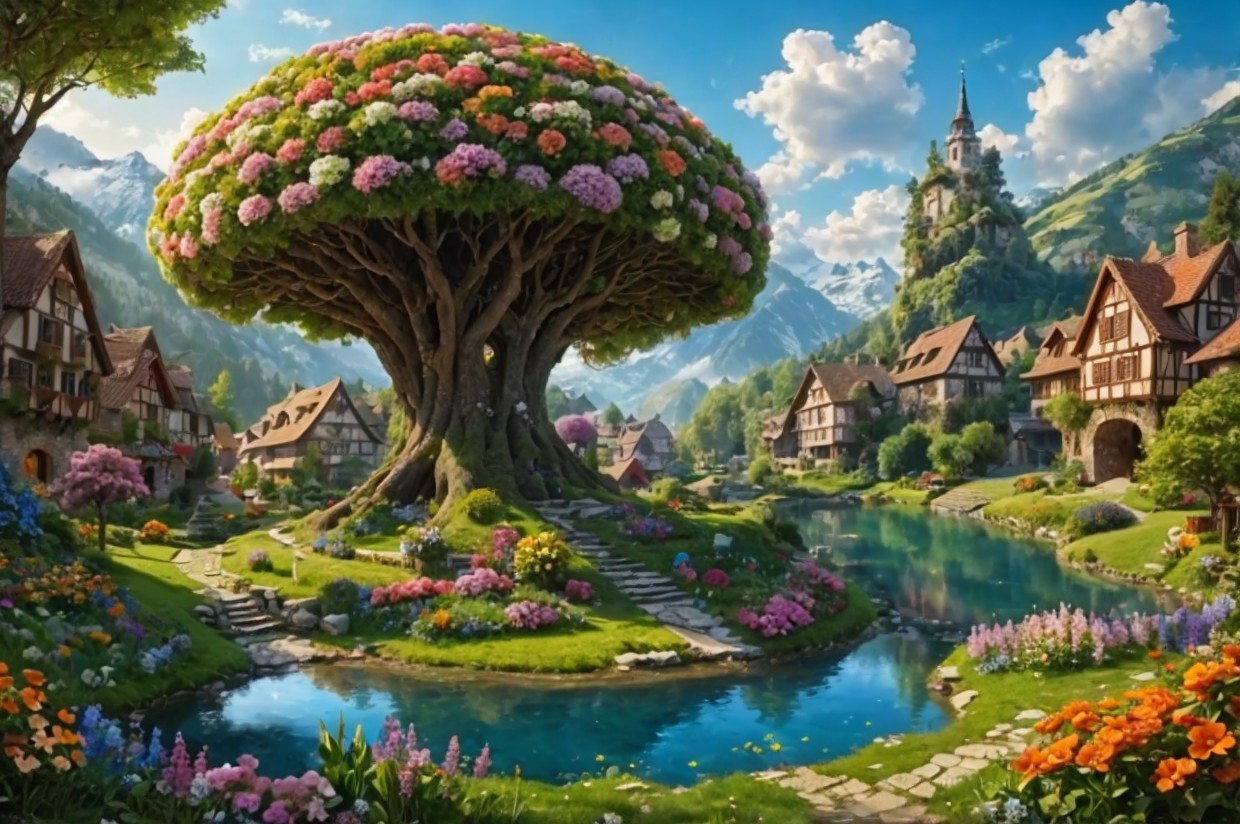 A quaint village with half-timbered houses, vibrant flowers, a large blossoming tree, and a reflective pond, all under a sunny, mountainous backdrop.