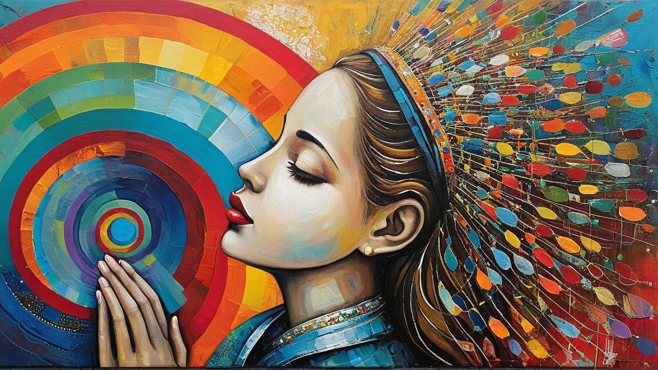 A vibrant painting featuring a serene woman with closed eyes, praying. Behind her is a colorful swirl of rainbow hues, enhancing her peaceful expression and intricate headdress design.