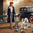 A stylish woman in a red beret walks her poodle in an autumn park. Pigeons surround them near an old-fashioned car, while vibrant fall leaves scatter the ground.
