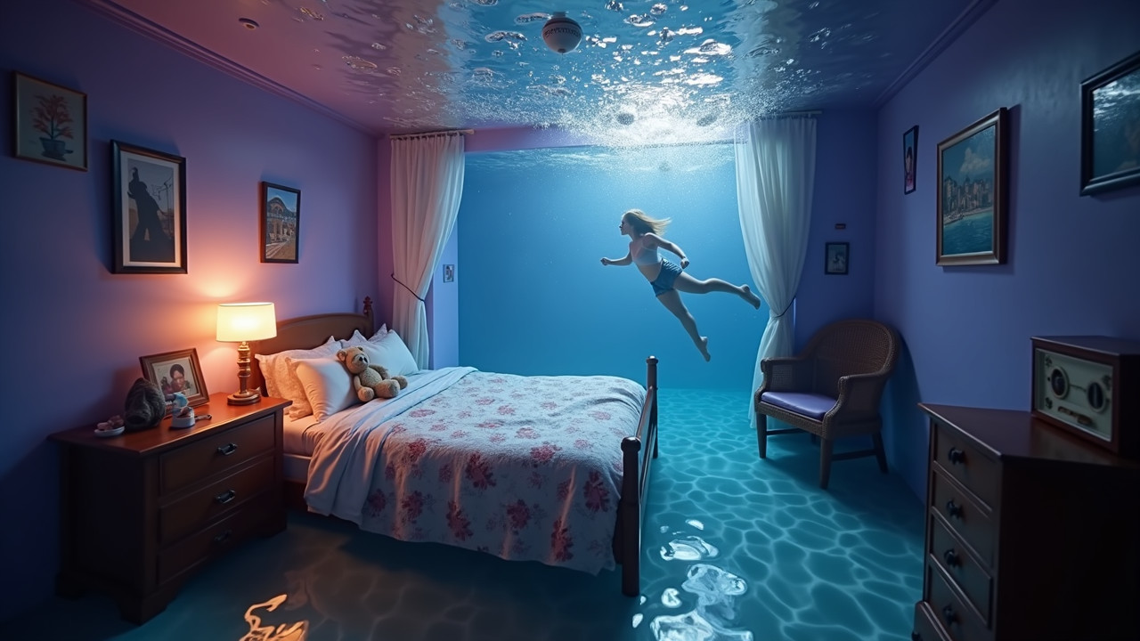 A whimsical underwater scene depicts a bedroom submerged in water, with a girl swimming above a bed. Soft light filters through, illuminating the tranquil, blue surroundings.