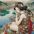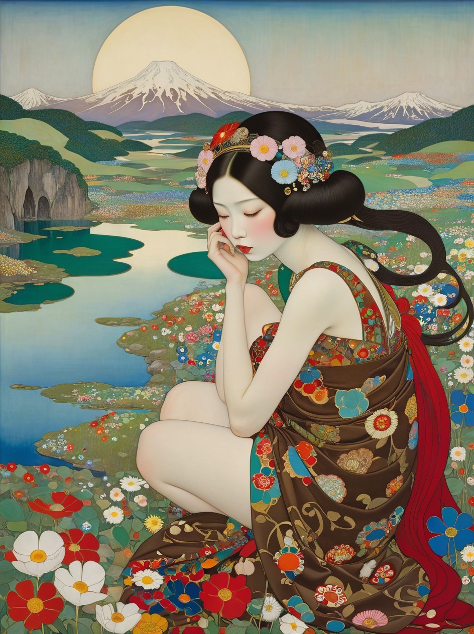 A stunning artwork in the ukiyo-e and art nouveau style features a Japanese woman with intricate floral hair accessories, her black hair flowing. She is clad in a brown kimono with vibrant floral embroidery. The backdrop showcases a magnificent snowy mountain with a prominent moon, surrounded by a serene river and a