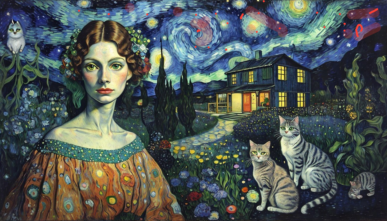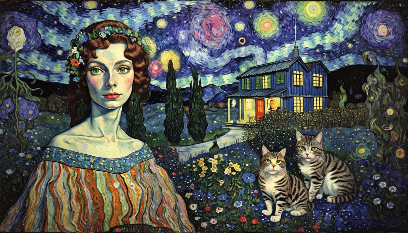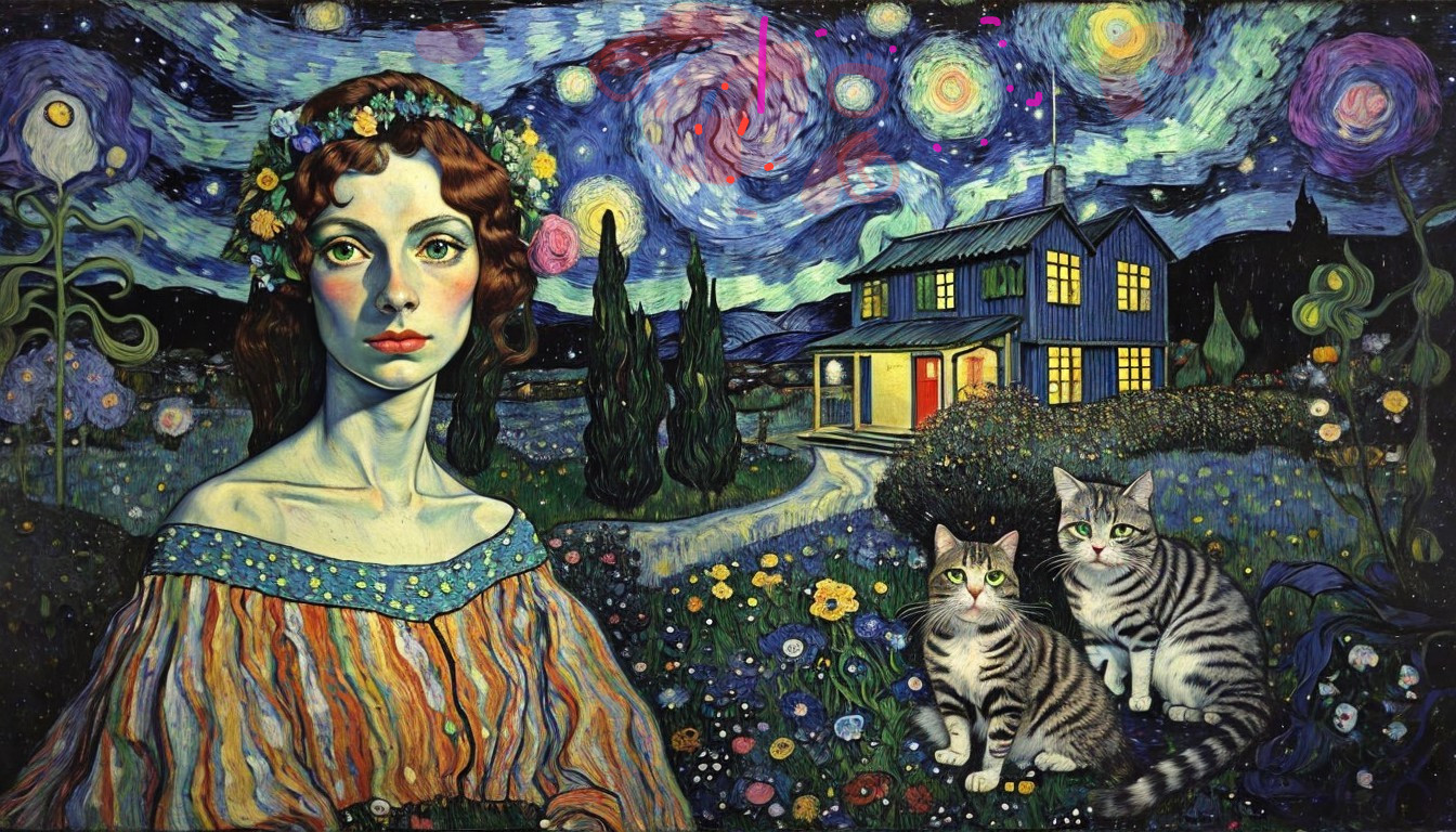 + Prompt:beautiful woman monster AND a cat hanging out by stone cabin, cosmic sky, weird shadowy creatures, by Egon Schiele, David Lynch and Tove Jansson, mixed media, miniature