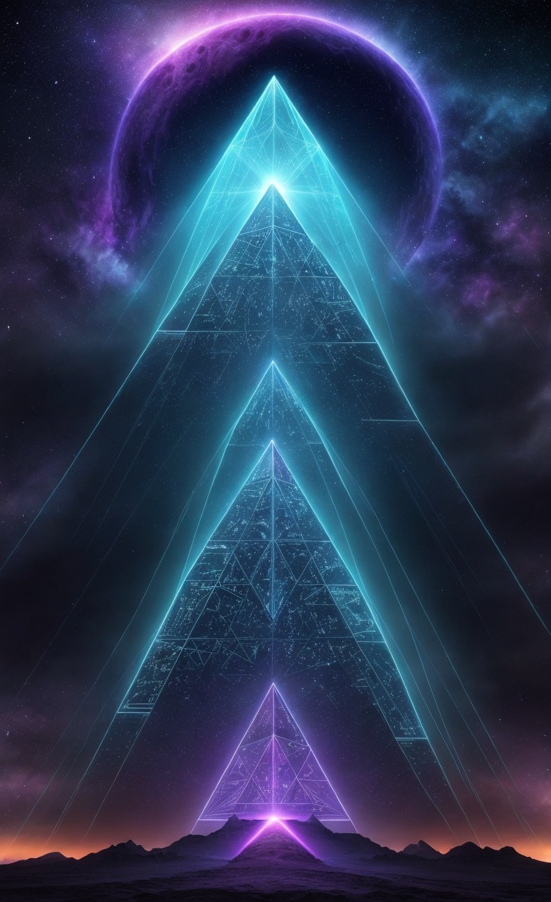 + Prompt:Advanced extraterrestrial pyramid, blending high-tech features with arcane sacred geometry. Illuminated by glowing runes and crystals, adorned with captivating geometric patterns. The celestial dance of the sun, moon, and planets unfolds amidst billowing nebula clouds in a vast cosmic sky. Ultra-realistic landscape beneath this complex celestial canvas. astral projection, alien contact, and surreal psychedelic vibes inspired by the sci-fi LSD art aesthetic. In the style of Cameron Gray
