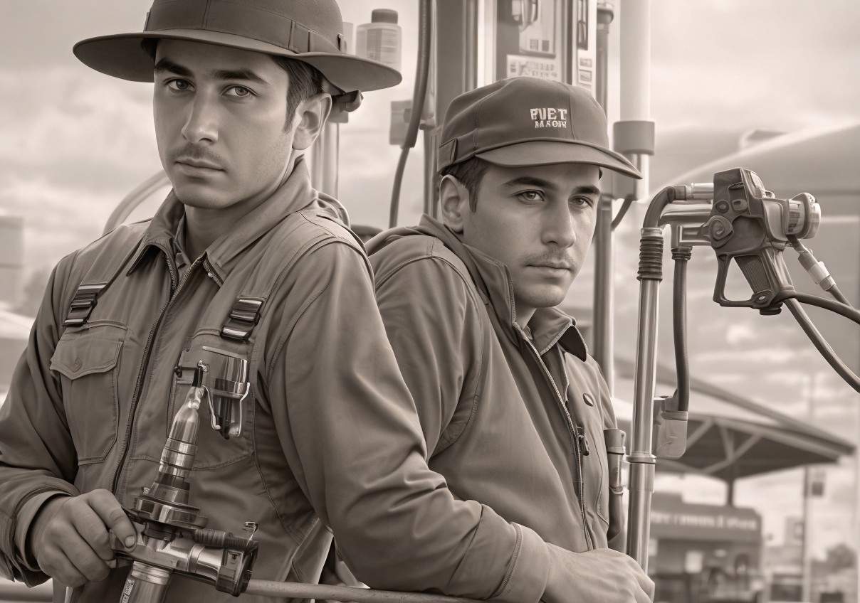 Two Men in Work Uniforms by Industrial Equipment