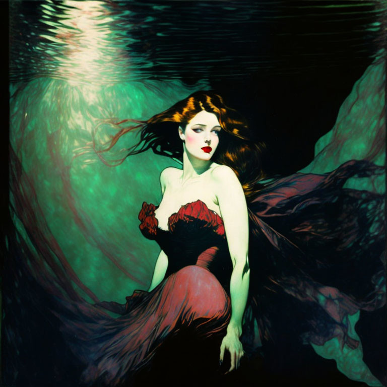 + Prompt:Woman with dark eyes and red lips in a silk dress floating underwater, light rippling above her, in grunge style, limited palette, texture, collage, correct anatomy? correct forms