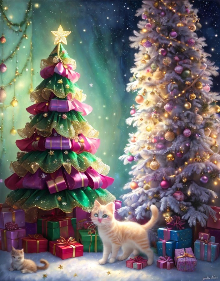 Prompt: The most beautiful magical Christmas tree lit up from top to bottom with beautiful soft pastel colored decorations, glitter and lights. There are wrapped presents under the tree and a cute white kitten at the bottom of the tree laying down.