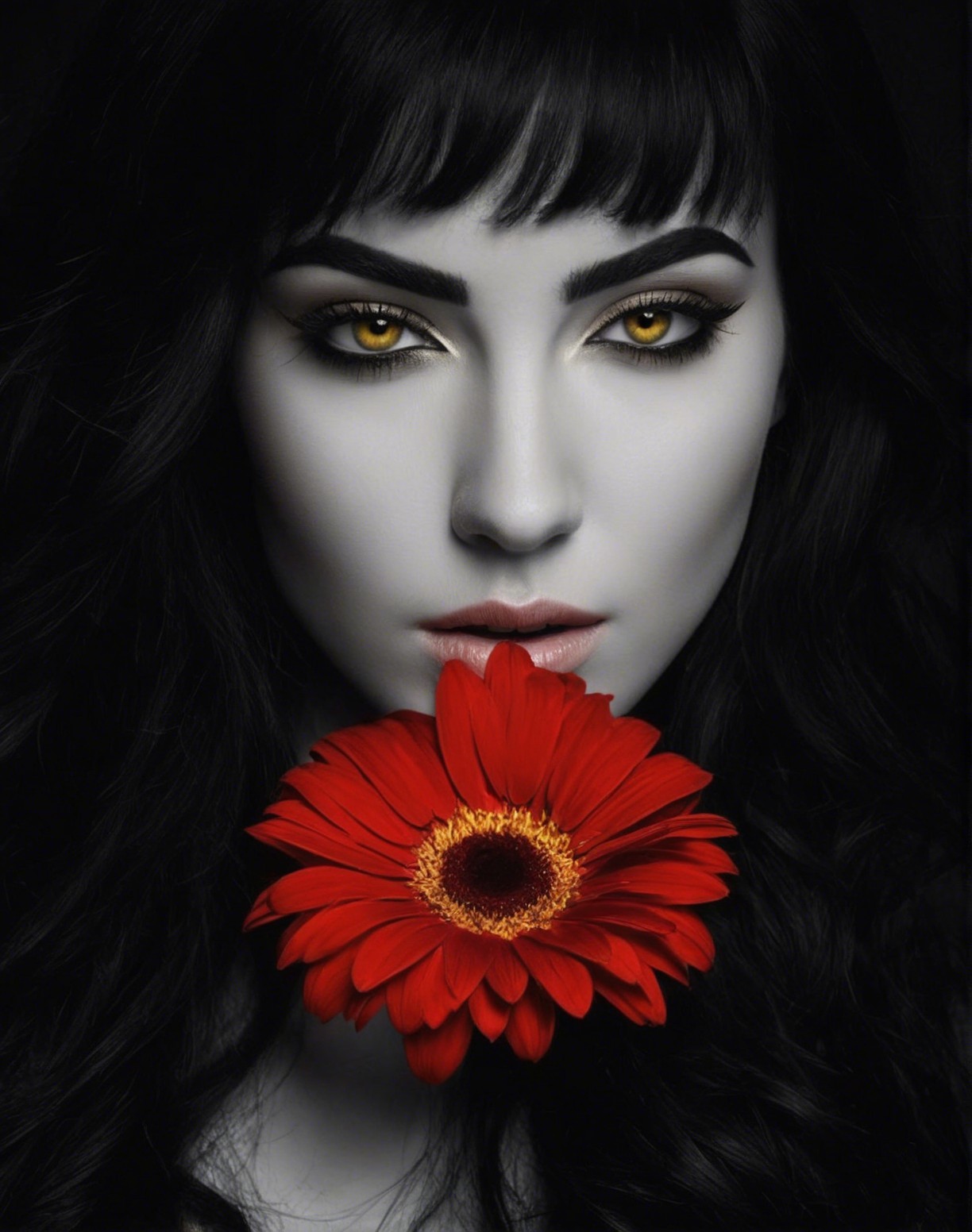 Prompt: Create a portrait of a woman with striking features. Her skin tone is a warm, golden yellow She has bold, dark eyebrows that accentuate her expressive eyes, which are painted in deep shades and have a piercing gaze. The eyes are almond-shaped and set slightly apart, with the eyelids adorned with dramatic black eyeliner.