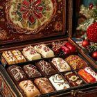 An ornate box filled with exquisite chocolates in various shapes and designs, adorned with intricate patterns. A delicate orange rose adds a touch of elegance to this luxurious display.