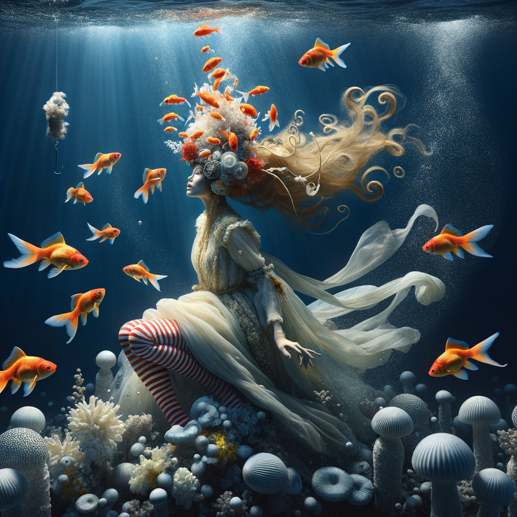 A whimsical underwater scene features a woman with flowing hair adorned with flowers, surrounded by vibrant goldfish and coral, creating a magical, ethereal atmosphere beneath shimmering light.