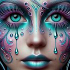 A close-up portrait of a woman with vibrant, teal hair and striking makeup featuring shades of blue and purple. Her skin glistens with droplets, enhancing her captivating gaze and ethereal look.