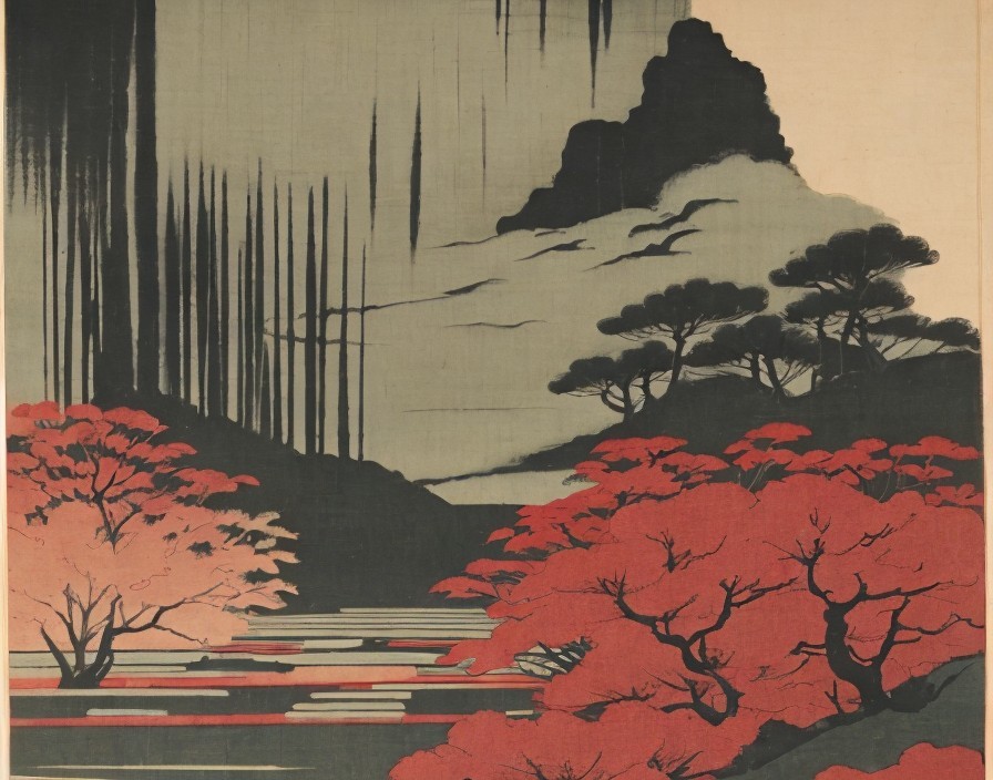 Asian landscape painting: tall bamboo, misty mountains, red foliage by river