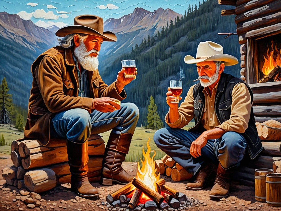 Two rugged cowboys sit by a campfire in a scenic mountain landscape, enjoying drinks. One has a long beard and wears a cowboy hat, while the other sports a white hat, reflecting warmth and camaraderie.
