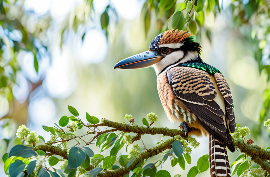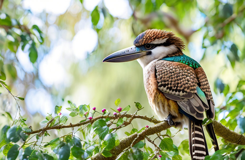 Kookaburra sits in tree,ent,green,giant,old,whole body,many dry and twisted branches,huge eyes,birds,extremely detailed,flowering,sunset. Just like in the base image