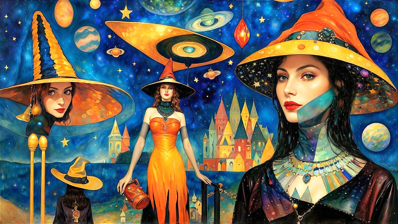 + Prompt:Three Attractive WITCHY women in leather dress and with extremely large transparant hats. Cosmic nightsky background with stars and planets. Wonderful oil on canvas photorealism by Gustav Klimt.