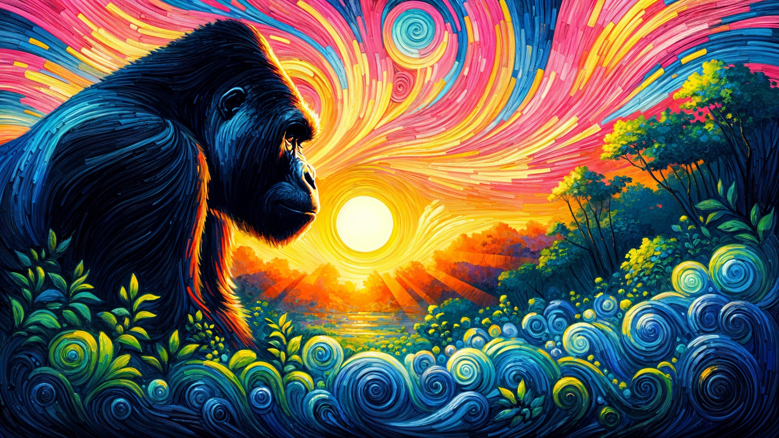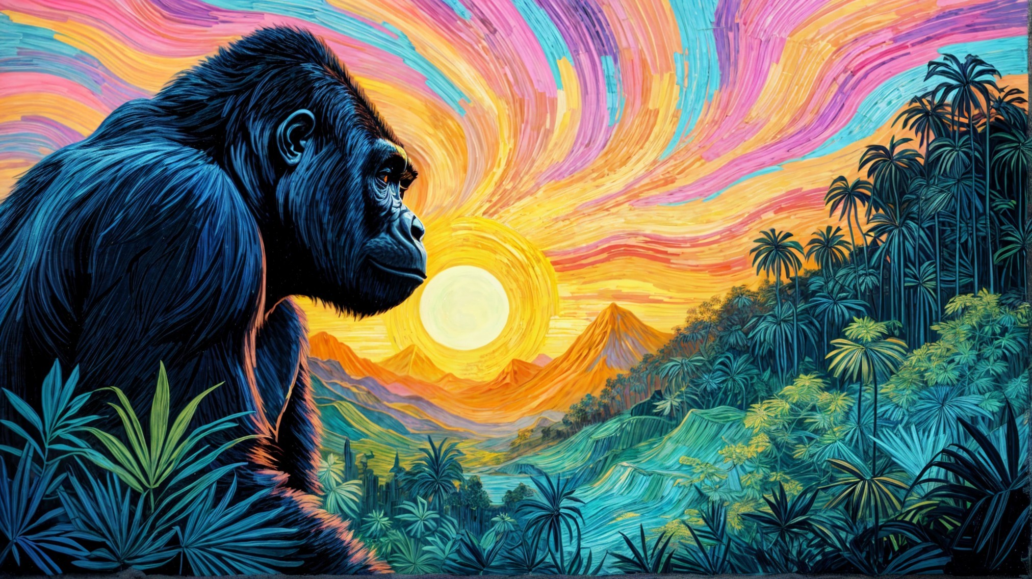 Tropical Sunset with Gorilla Silhouette and Mountains