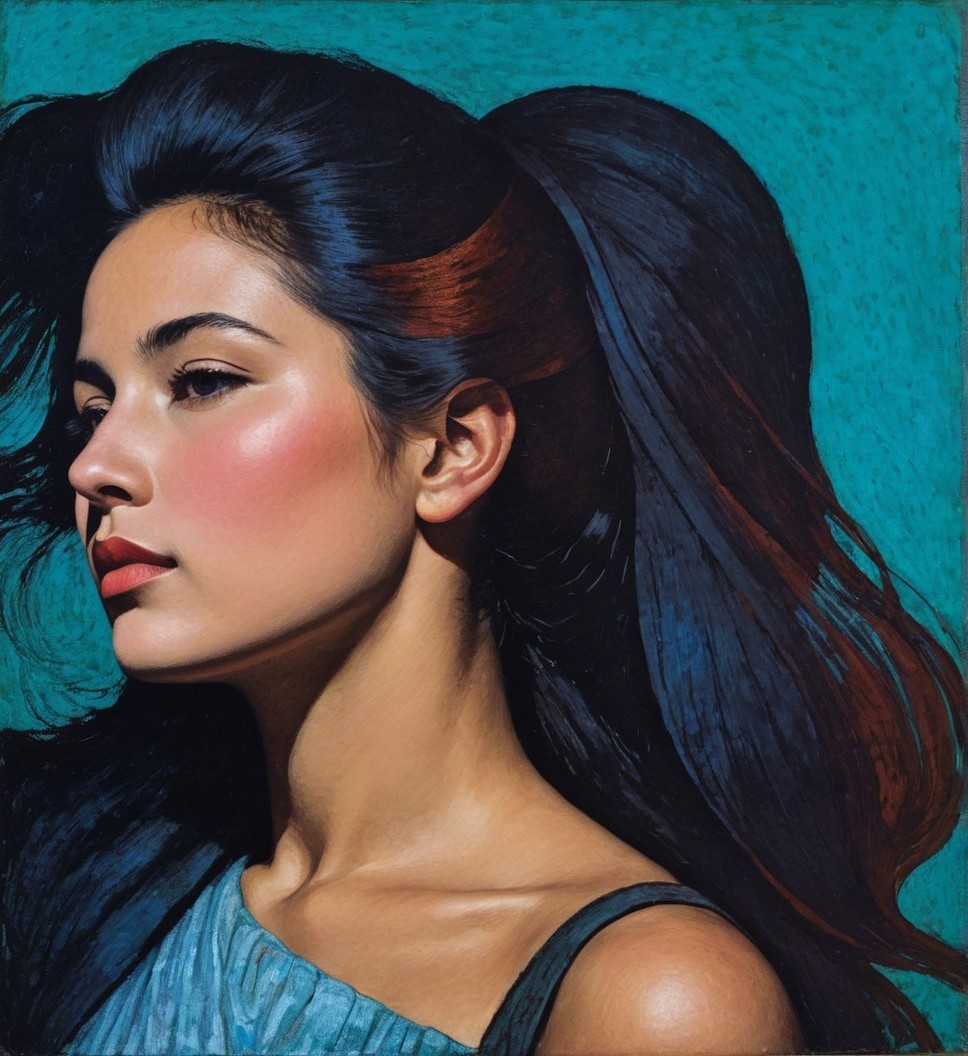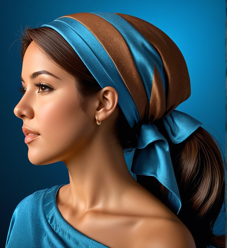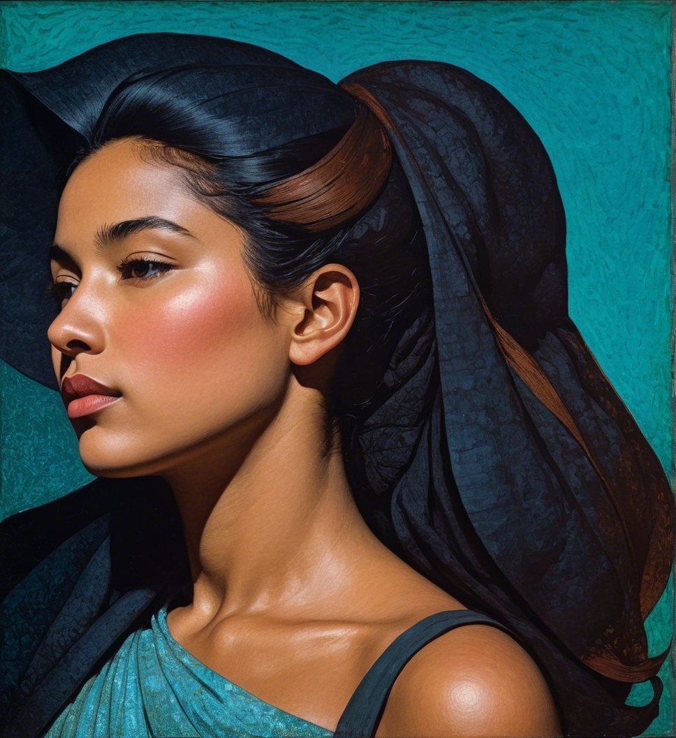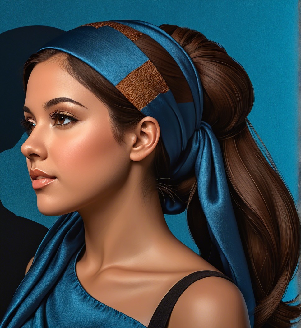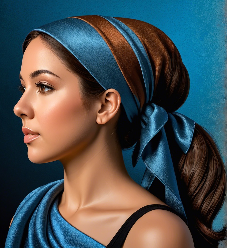 Stylized portrait, blue satin headsscarf, brown hairstreaks, stylized collagraphy by Ed Binkley, stippled elements, cel-shaded, sculpted, angled, side view, great depth and scale, dreamlike color palette with HDR and UHD, visible textures, --ar 1:1 --q 2 --s 750, brightened color palette, Portrait, Bohemian-inspired nitrofrottage, blending neutral tones with orphism and romanticism, sculpted by Gil Bruvel, Iwona Lifsches, Ho Baron, double-exposure, bokeh, brightened coloring, color palette of light-blue, starfleet-blue, light-black, flares of baby-blue, interwoven textures of metalliccolors, intricate color coding system merging with the portrait, immersive RHADS aesthetic, UHD, HDR, plasticity 1.3, overspray of watercolor, atmospheric depth, parallax occlusion for added dimensionality, raytraced shadows, Feminine futuristic foampunk portrait, bold outlining featuring geometrical 3D effects, linocut by Brad Kunkle. Whimsical and intricate design, segmented composition, cream-and-gold color palette with diverse patterns, space-like surroundings, dark blue and beige background adorned with white stars, elaborate dark blue, gold, and shimmering ornamentation, evoking mystery, delicate filigree-like line work, Art Nouveau-inspired, fantasy elements, ethereal atmosphere, intricate details, cosmic theme, magical and enchanting ambiance, airbrush and sprayed thin watercolor, intricate lighting effects.joyful modern art style by Jackson Guice reminiscent of comic book cover art, Gothical fantasy, offset print, contouring outlines, color scheme light-blue beige brown, hues by William Bradley, dynamic lighting 1.7, VFX-inspired softened lighting, brightness 1.3, infused with a 1960s retro design twist, intricate color scheme, complex op-art inspired by Georges Seurat with intricate patterns