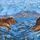 Colored filigree pencil drawing, flood, storm wind, a man blown away, the wind blowing through the high waves, rocks, lighthouse surrounded by wild water, in the foreground grass, fair weather, patchwork by Jan van Goyen and Jean-Baptiste Monge