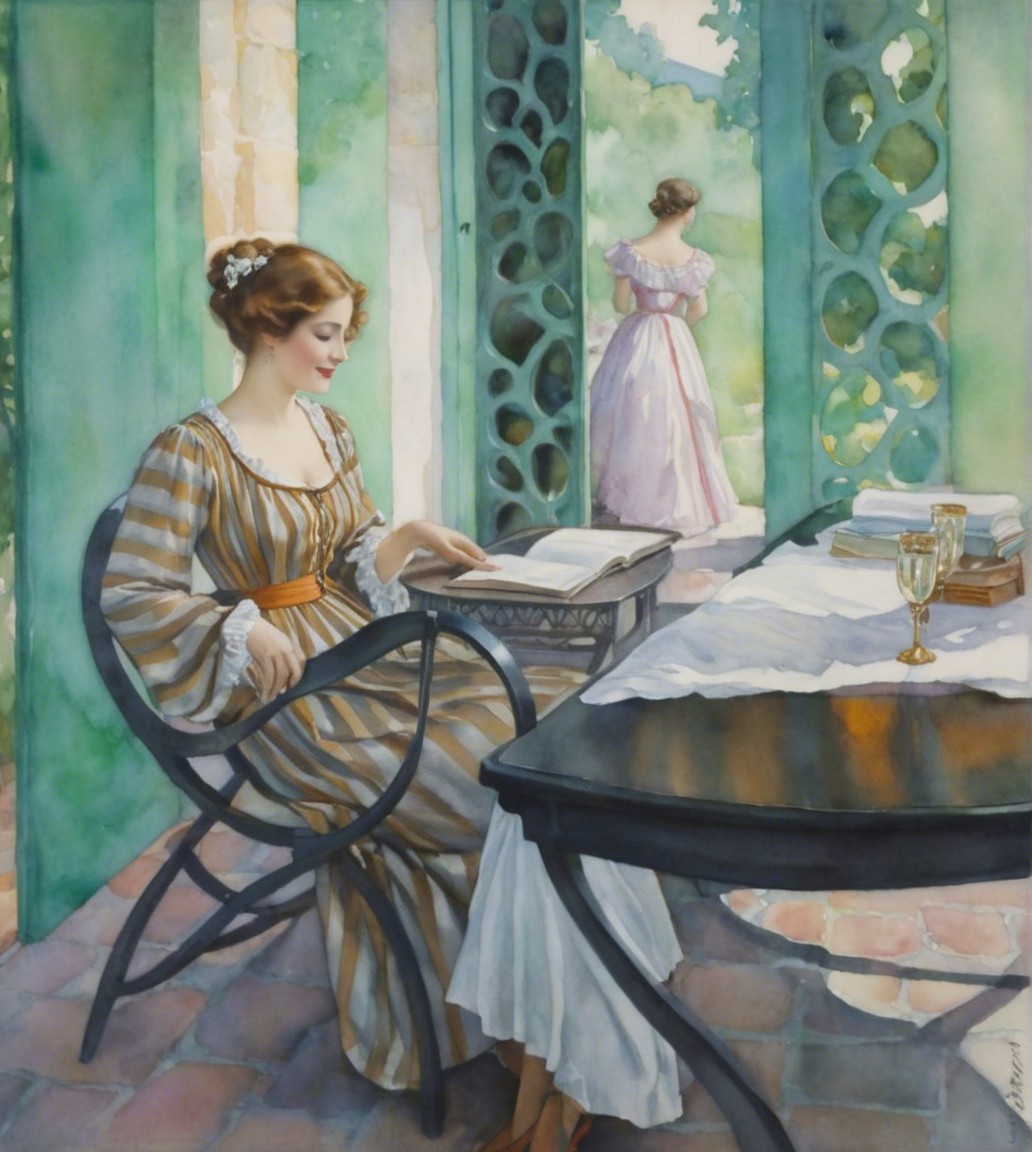 A serene woman in a yellow top and long gray skirt sits by a sunlit window, gently gazing at a photo frame, with a vase of flowers on the table, evoking a tranquil, reflective atmosphere.