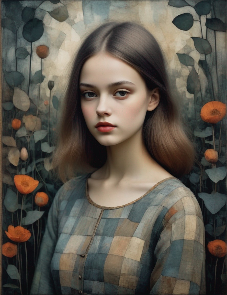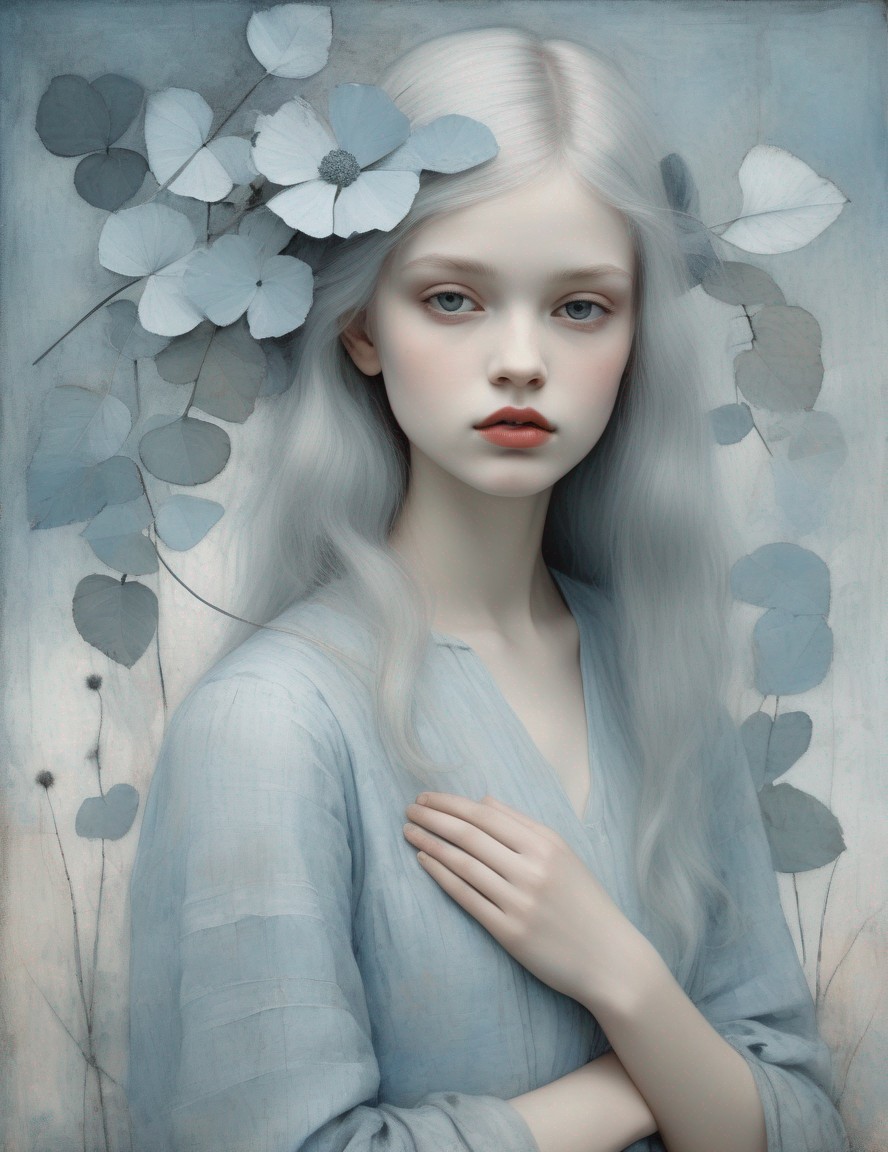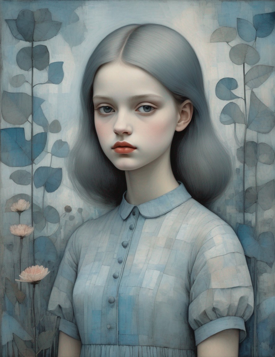 + Prompt:Beautiful girl's portrait in pale blue and grey, garden, Art Brut, moody, somber, desaturated colors, in the style of Paul Klee, Arthur Rackham