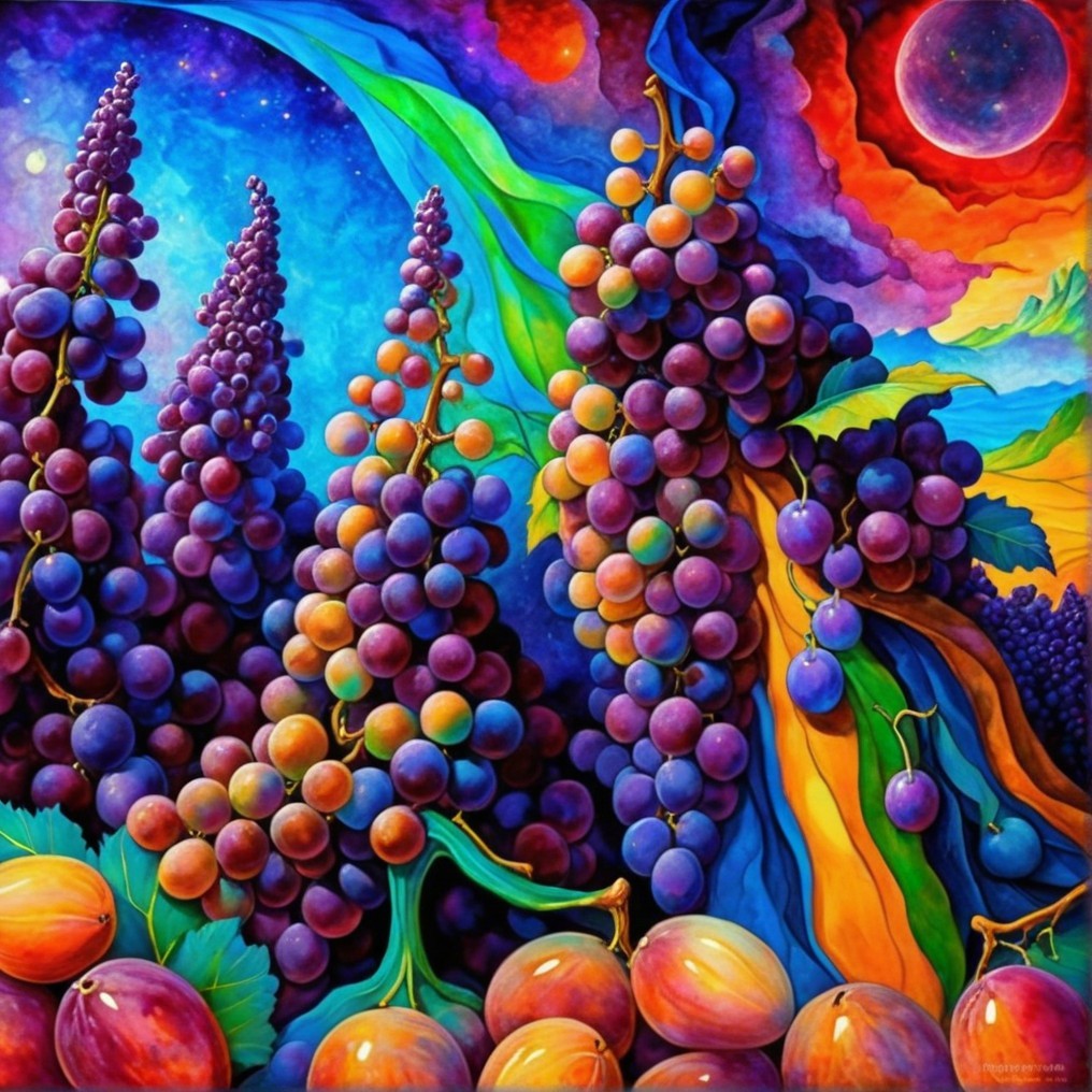 A vibrant, surreal landscape filled with clusters of purple grapes, set against a colorful backdrop of mountains and a starry sky, blending bold colors and shapes in a harmonious visual feast.